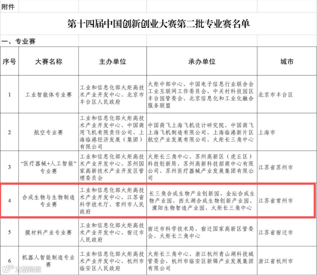8月25日,工业和信息化部火炬高技术产业开发中心公布第十四届中国创新创业大赛第二批专业赛名单,常州成功入围并首次承办中国创新创业大赛合成生物与生物制造专业赛,本次赛事将于9月启动报名,敬请期待!