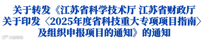 《江苏省科学技术厅 江苏省财政厅关于印发〈2025年度省科技重大专项项目指南〉及组织申报项目的通知》(苏科资发〔2025〕77号)已于日前正式发布,现转发给你们,并要求如下: