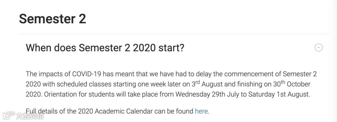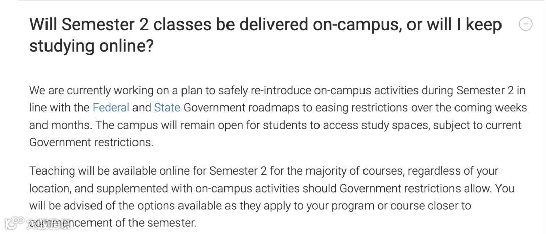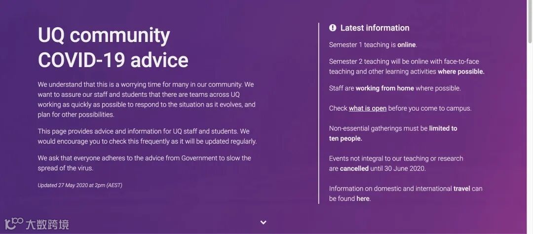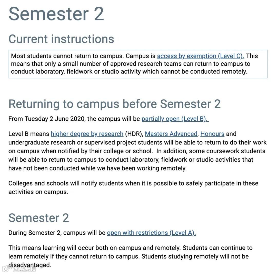 根据昆士兰大学官网通知,COVID-19的影响导致学校不得不推迟2020年第二学期的开学时间。学校希望最终能够在第二学期开展一些校内活动,但目前联邦和州政府尚无明确的时间表来确定何时将放宽或取消社会隔离要求。