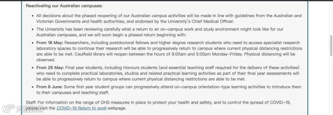 关于分阶段重新开放澳大利亚校园活动的所有决定将根据澳大利亚和维多利亚州政府及卫生当局的指导方针做出,并由大学的首席医学官批准。
