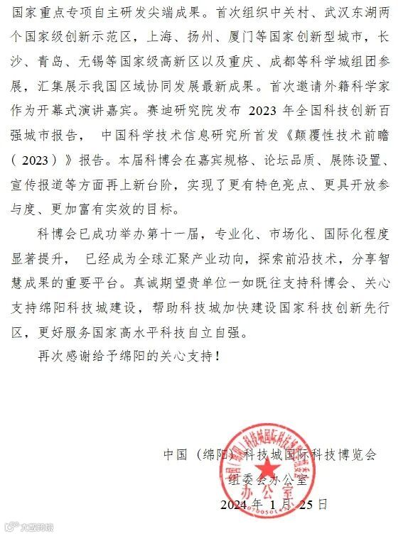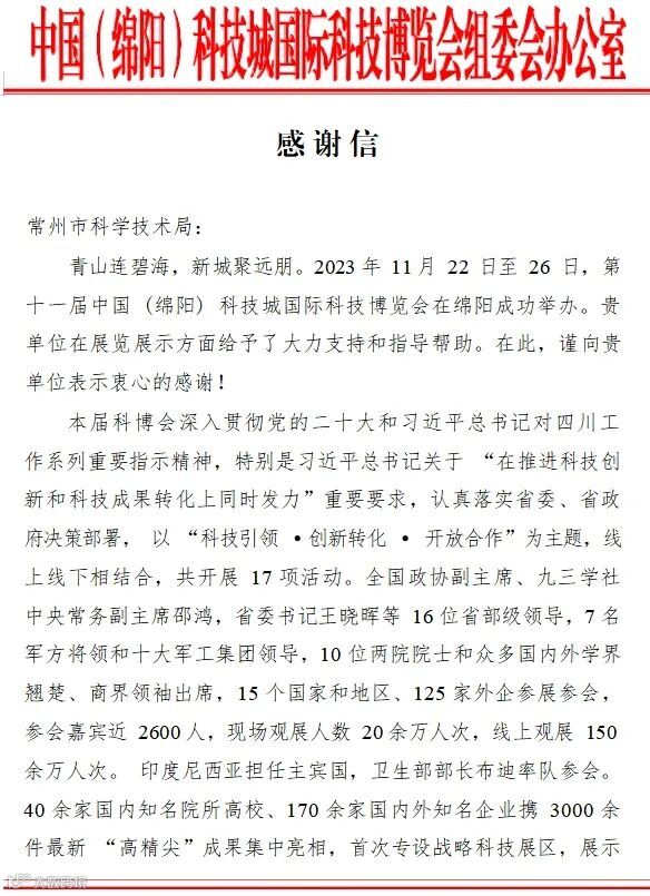 近日,常州市科学技术局收到中国 (绵阳) 科技城国际科技博览会组委会办公室发来的感谢信,点赞常州市科技局给予第十一届中国 (绵阳) 科技城国际科技博览会在展览展示方面的大力支持和指导帮助。