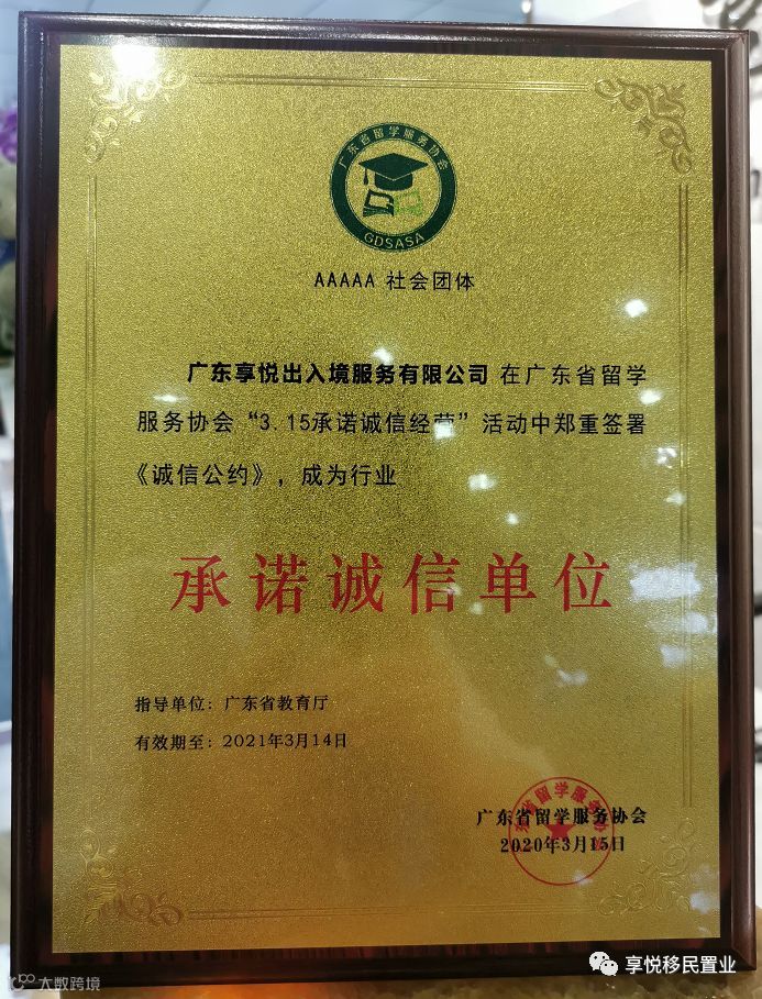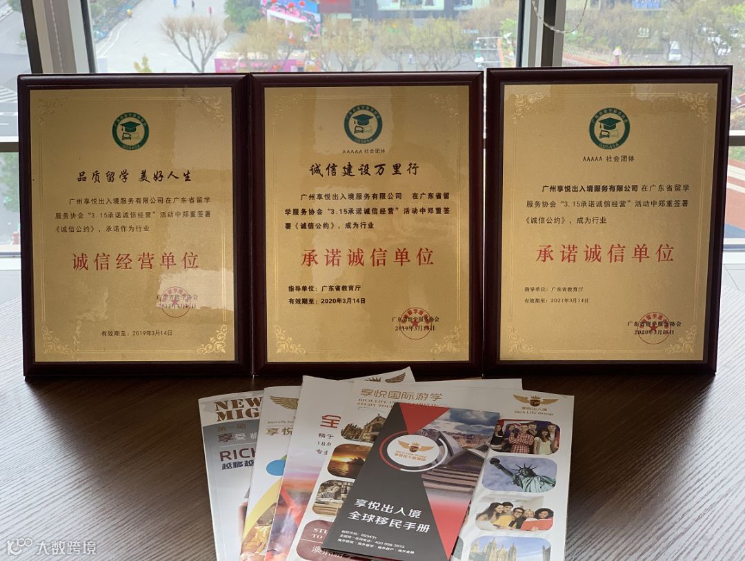 享悦出入境信誉立业、口碑如一,以谨慎、快捷、高成功率的专业服务享誉业界,公司于2015年6月荣获“中山市出国留学、游学类金牌教育机构”,2018年1月被广东省留学服务协会指定为中山办事处;2018/2020年,连续三年被广东省留学服务协会评选为诚信经营单位,赢得社会各界广大客户的好评与信赖。