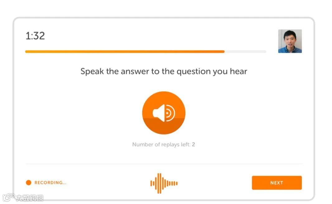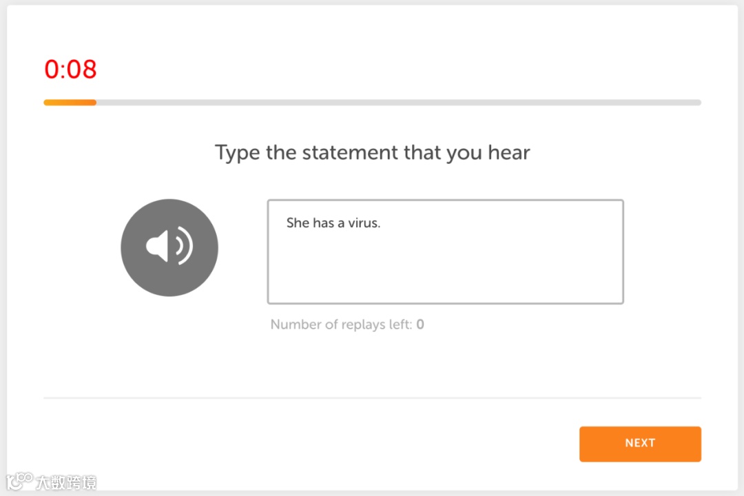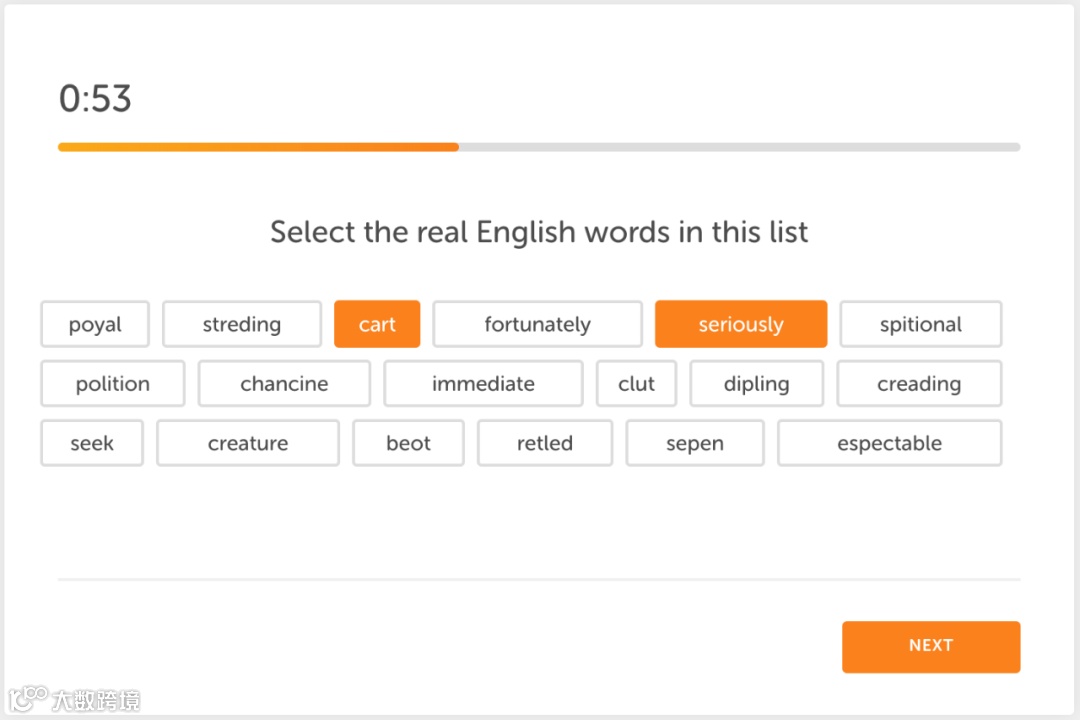多邻国英语测试采用自适应技术出题:通过考生前面答题的正确率来出后面的题目。所以能够在相对较短的时间内检测出考生的英文水平。