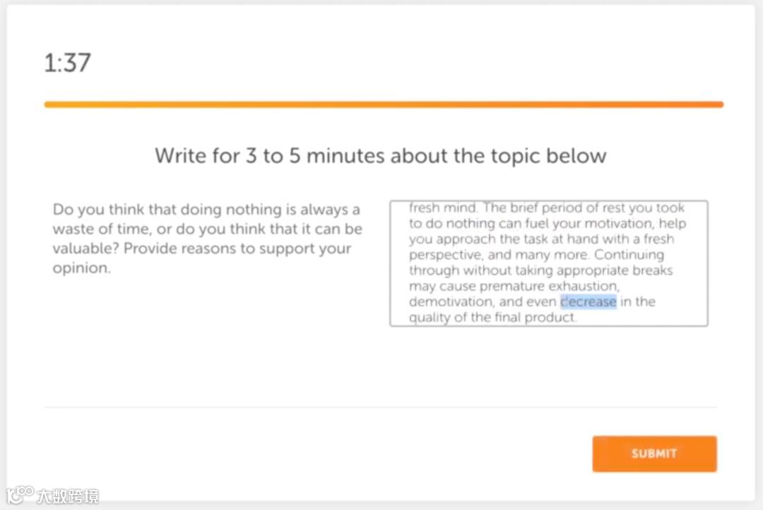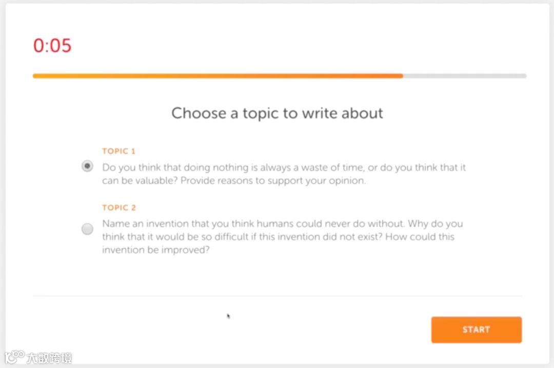 在写作样本环节,考生被要求在两个话题中选择其中一个进行3-5分钟的写作。