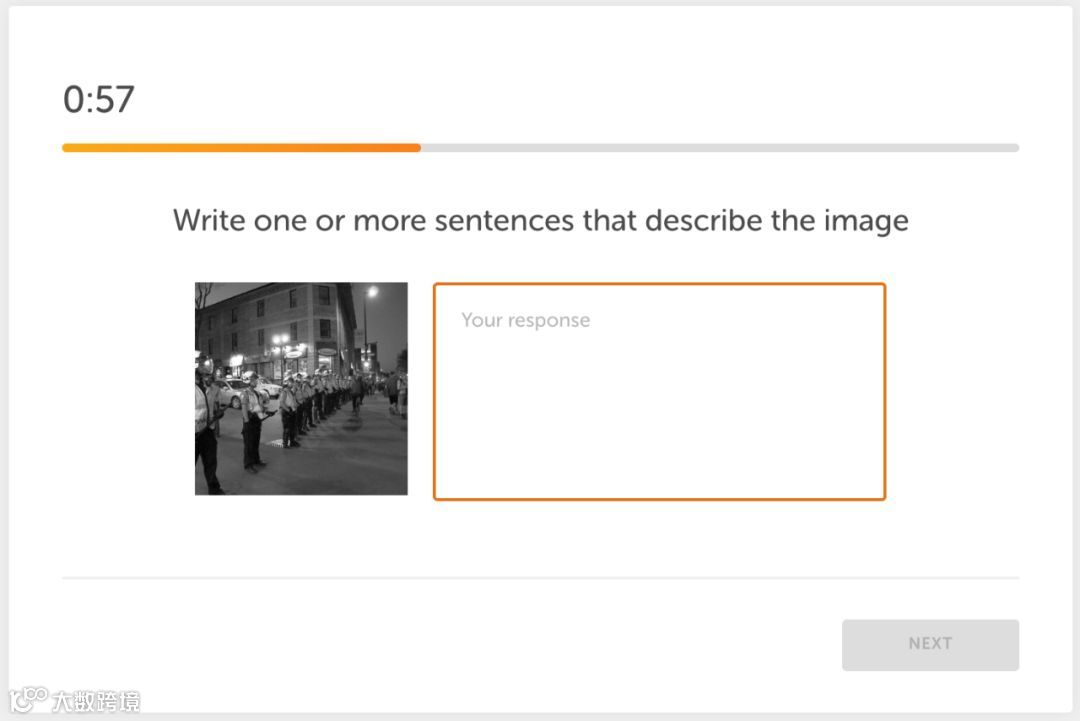 这道题要求考生根据屏幕出现的一张图片,写出至少一句话进行描述。题目对考生写下句子的数量没有上限规定。在规定的时间里,学生可以写下任何等于或大于一个的数量的句子。