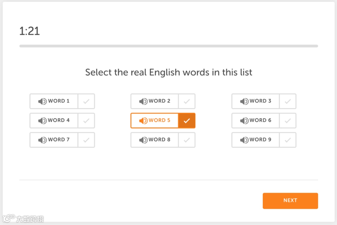 一整道题完成的时间时间是1分30秒。在有限的时间内听单词的次数不限。如果一次听不清楚,考生可以多点击几次,直到听清为止。如果确定该单词为真正的英语单词,需要点击勾号。