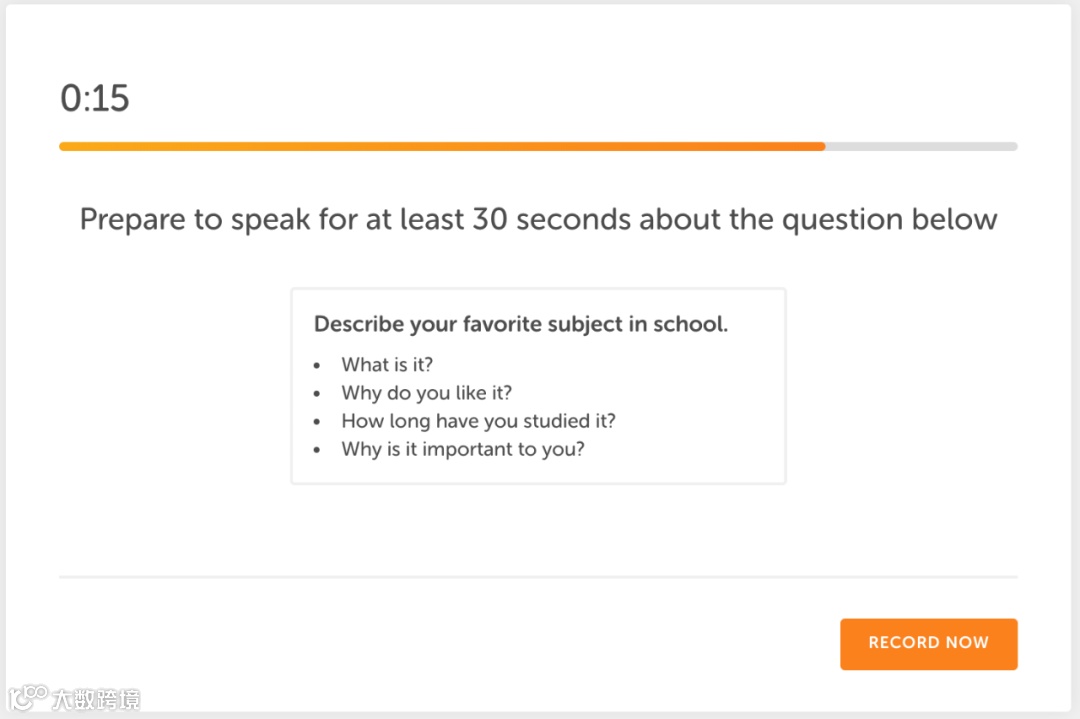 在这题中,考生被要求根据听到的话题或者问题,作一段至少30秒的演讲。