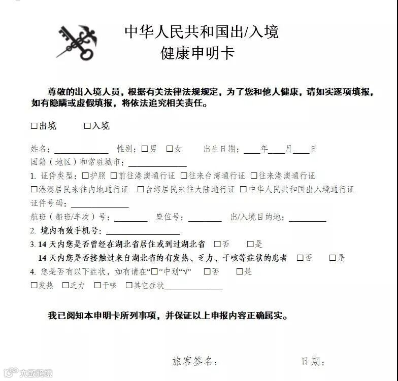 3月3日零时起,已启用第四版《中华人民共和国出/入境人员健康申明卡》,所有出入境人员在出、入境时必须向海关出示电子申报条形码信息或完整填写的纸质版《中华人民共和国出/入境健康申明卡》,供海关关员验证,并配合做好体温监测、医学巡查、医学排查等卫生检疫工作,海关关员会在验证合格后予以放行。