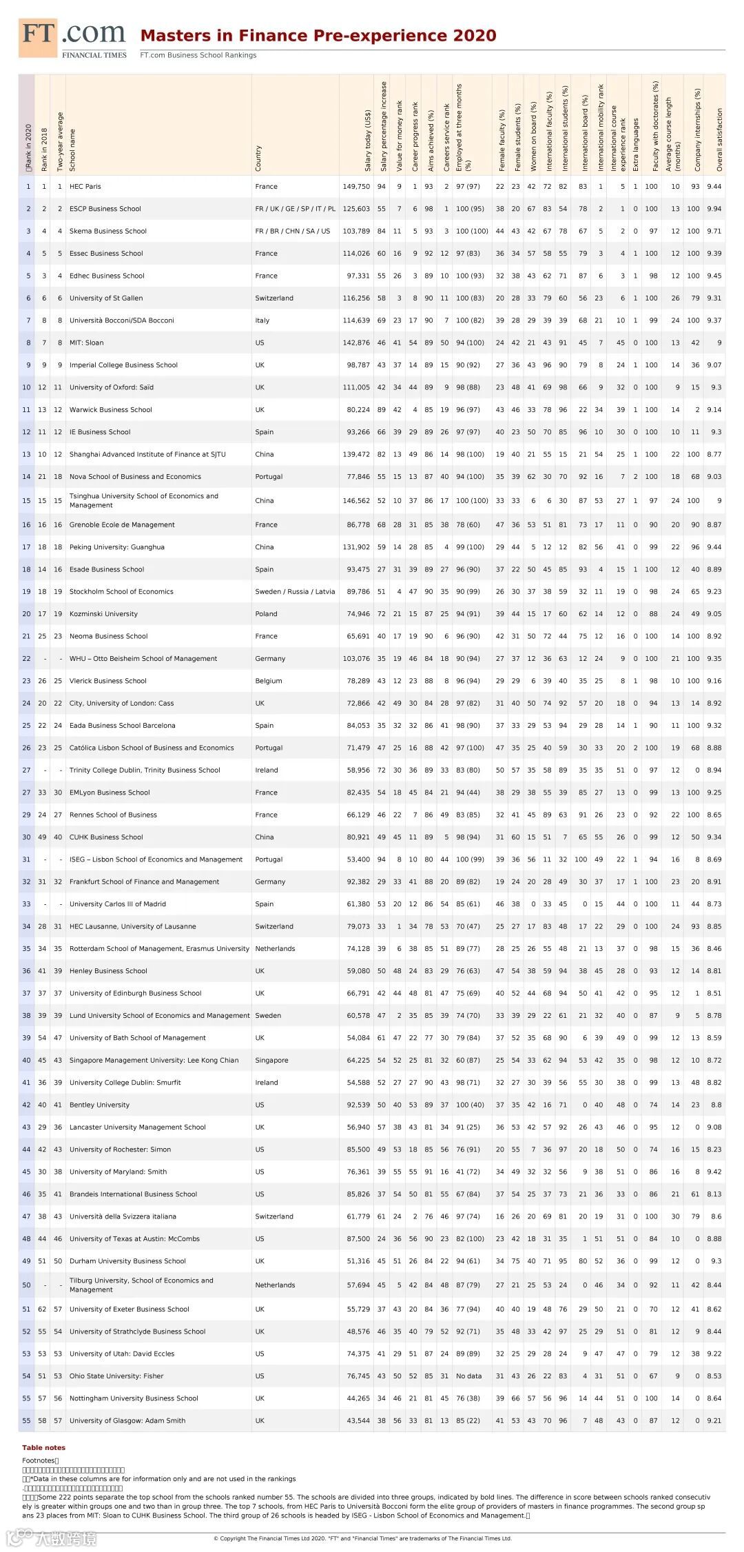 在过去的2019年,因为未知原因,《金融时报》并未更新经验前金融硕士课程排名(之前为每年一次更新)。今年,经过20项数据的考核评估,全球范围内总计有55家商学院的金融硕士课程上榜。