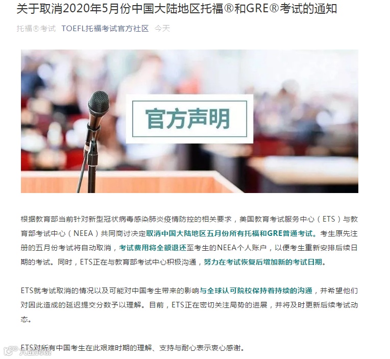 今天教育部考生中心(NEEA)和ETS就发出通知:取消5月份所有托福、GRE考试。