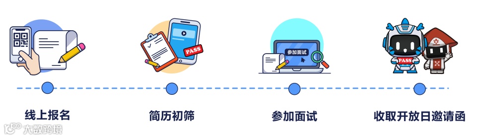 线上完成报名,经简历筛选后,方可参与面试,通过即可参加线下开放日活动。