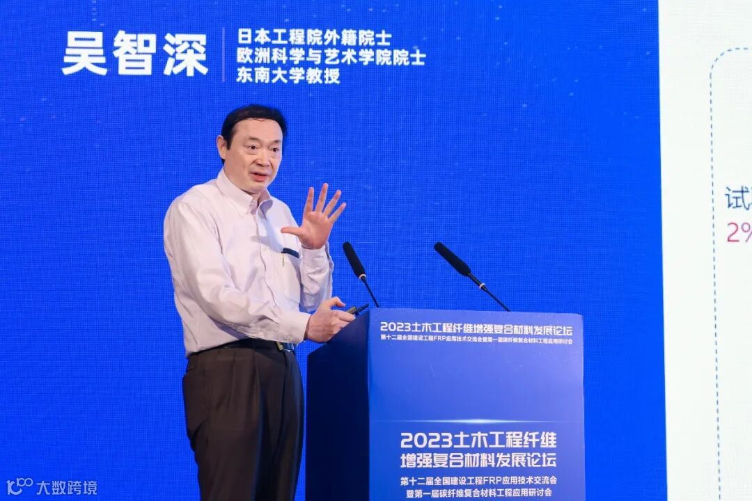东南大学吴智深教授的报告主题为“纤维复材(FRP)—钢筋混合增强混凝土结构及其应用”,详细介绍了钢筋混凝土结构在长寿命和高韧性需求下的发展要点。
