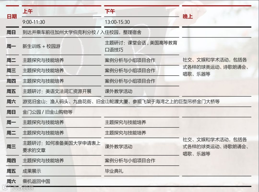 除了课程外,该项目还组织丰富多彩的课外活动,包括旧金山海湾地区观光、金门大桥以及北滩等。
