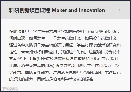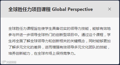 该项目包含全球胜任力、人工智能发展、科研创新、商业战略四大前沿项目主题学术课程任选其一。