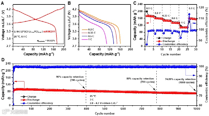 上述高结晶度Li-Y-Cl材料也能实现良好的电池性能。采用单晶LiNi0.8Mn0.1Co0.1O2(scNMC811)作为正极,450 ℃退火的Li2.65YCl5.65作为固态电解质,Li-In合金作为负极组装的全固态电池即便在3 C的电流密度下也能实现长达1000圈的稳定循环,并且其中780圈循环的容量保持率在80%以上,超过了文献中报道的基于Li3YCl6的同类型固态电池。