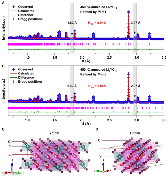 空间群,那么Pnma空间群很可能就是Li3YCl6的真实晶体结构。当研究者使用Pnma结构作为模型对中子衍射结果进行Rietveld精修时,包括上述1.82 Å和2.97 Å在内的所有实验观察到的衍射峰都和计算结果吻合的很好(图2B)。因此,Li3YCl6的实际结构应该是这里得到的Pnma结构,而并不是长久以来被普遍接受的