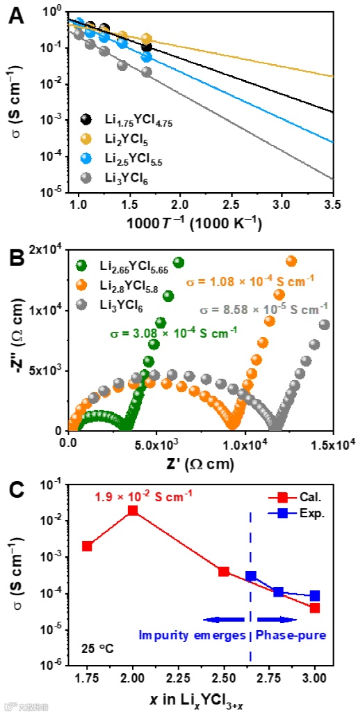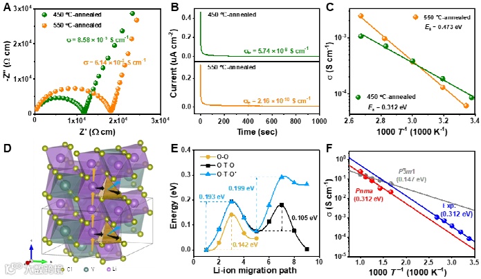 Pnma结构的合理性还体现在它能准确预测Li3YCl6离子电导率随着化学计量比的变化。研究者用AIMD对一系列Pnma结构的LixYCl3+x材料的离子传输行为进行了理论计算研究,发现Li/Y比从3降低时将有效的促进Li+在室温下的传输效率;当x= 2(对应Li2YCl5)时,计算所得的离子电导率甚至高达1.9 × 10-2 S cm-1。与AIMD模拟揭示的趋势一致,实验测得的离子电导率也随着Li/Y比的降低而显著上升,并且具体数值和理论计算几乎完全一致(图4C)。当x < 2.65时,材料在本工作的合成条件下难以维持纯相。但是,鉴于其他成分都展示了很好的理论-实验一致性,如果这些成分能在未来的工作中被稳定在纯相,那么也很可能展示更高的离子电导率,甚至达到上面预测的1.9 × 10-2 S cm-1 (对应成分Li2YCl5)。值得注意的是,通过化学计量比的调控,Li-Y-Cl固态电解质得以在高结晶度状态下达到了原本只能在部分非晶化状态下达到的10-4 S cm-1量级的离子电导率。由于高结晶度材料的离子传输并不依赖略微加热便会结晶、从而失去高离子电导率的非晶相,因此具有更好的热稳定性。