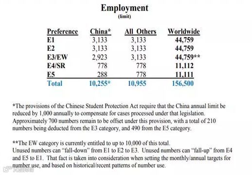 3、EB-3类别总额从40,040张增加到了44,759张,增加了4,719张,签证分配占比28.6%。也就是在2020财年,EB-3一共可分到44,759张签证。