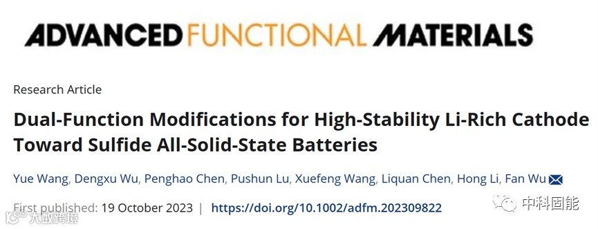 10. Dual-function modifications for high-stability Li-Rich cathode towards Sulfide All-Solid-State Batteries. Y. Wang, D. Wu, P. Chen, P. Lu, X. Wang, L. Chen, H. Li, F. Wu*. Advanced Functional Materials(IF=19.924), 2023, in press