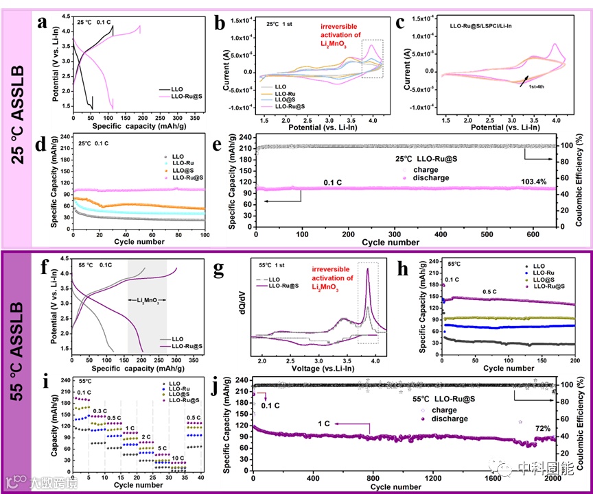 在液态体系LIBs和硫基ASSLBs 中评估了LLO的电化学性能。支撑文献显示了在传统的LIBs中,LLO在0.1C下的初始比充放电容量可达到327.87/282.82 mAh g−1,而在硫基ASSLBs (图3a)中初始比充放电容量仅为113.8/54.8 mAh g−1,远低于正常水平。这是因为首次充电时锂离子传输严重受阻,限制了Li2MnO3的活化。相比之下,LLO-Ru@S中Li+输运动力学得到了显著提高,原因如下: 一方面,Ru掺杂引入Ru-O共价键增强了LLO的氧晶格稳定性,抑制了LLO样品中氧释放引起的界面副反应,为离子迁移构建了稳定的界面。另一方面,硫化层大大提高了LLO氧化物正极与SE之间的界面相容性。图3b和3g中,LLO-Ru@S样品显示出更强的氧化峰,表明LLO-Ru@S/LPSCl界面上的动力学过程更好。值得注意的是,Li2MnO3的氧化峰明显强于其他三种材料,证实了Li2MnO3相的活化程度更高。图3e为室温下LLO-Ru@S正极在0.1 C时的循环性能。可以看出,经过650次循环后,LLO-Ru@S ASSB的容量几乎没有衰减。图3f所示,55℃下LLO-Ru@S电极的充放电比容量高达301.1 /204 mAh g-1, 再次证实了Ru体相掺杂和硫化策略可以有效地提高LLO在硫基ASSLIBs中的电化学性能。此外,LLO-Ru@S的ASSLB(图3j) 提供了2022个循环的超长寿命,在1C下的容量保持率>70%。