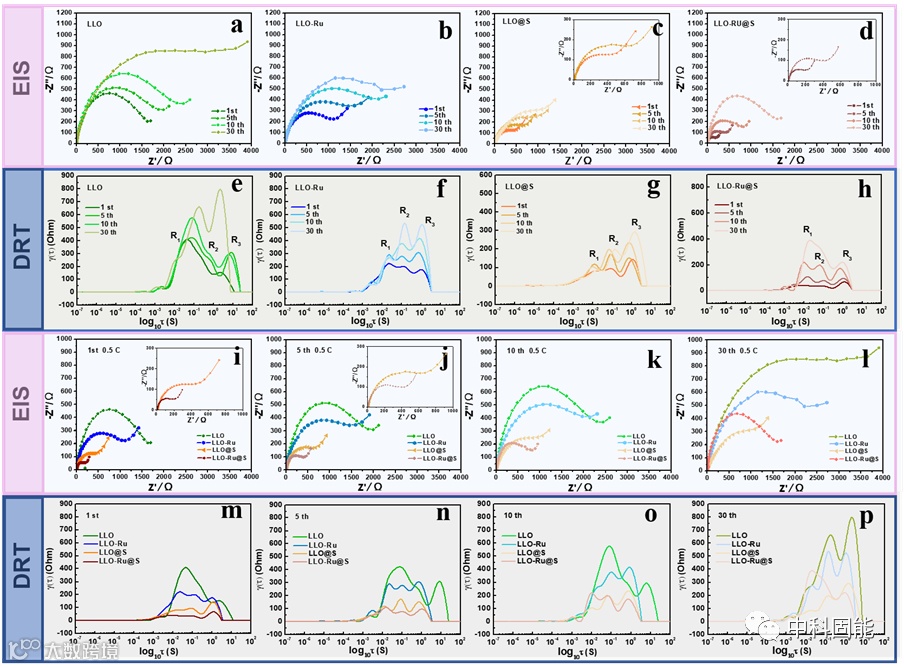评价界面稳定性和锂离子输运动力学对于解释ASSLBs中电化学行为的变化具有重要意义,可以通过电化学阻抗谱(EIS)测量和弛缓时间分布(DRT)分析来揭示这些变化。从图4a可以看出,LLO 的Rct从第1个周期到第30个周期急剧增加,而LLO-Ru@S ASSLB的Rct变化较小(图4d),即使30个周期后LLO-Ru@S的Rct仍然小于LLO的初始Rct。这表明LLO-Ru@S正极复合材料在电化学过程中具有稳定、快速的界面扩散动力学。为了准确区分Rct的演变,采用DRT技术对锂离子插入/脱嵌过程中阴极复合材料的电阻演变进行解耦。