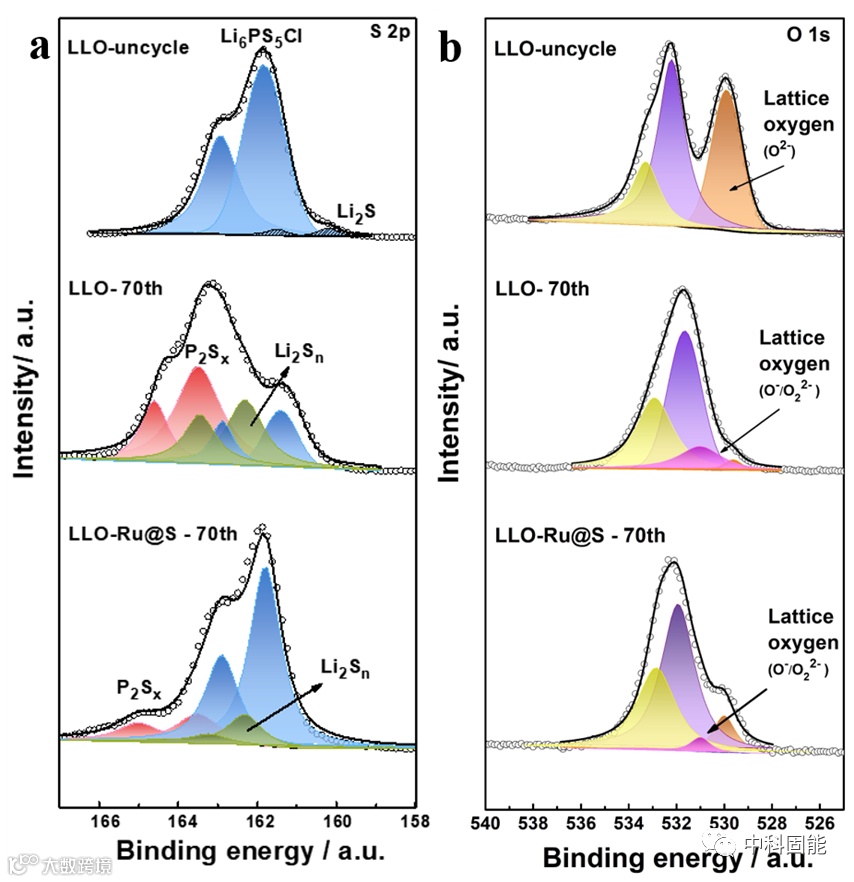 通过表面敏感的XPS测量对不同状态下LLO/LPSCl界面进行分析。图5a可以看出LLO正极和LPSCl电解质在充放电开始之前是化学稳定的。循环70个周期后,硫化物SE副反应产物的出现证实了LLO正极与硫化物SE之间的界面不稳定性。副反应产物会阻碍离子传输,增加界面阻力,最终导致容量衰退。与此形成鲜明对比的是,在LLO-Ru@S/LPSCl正极界面处,副反应产物的相对含量降低。这表明硫化策略有利于LPSCl维持可逆氧化还原过程,并有效抑制循环过程中与氧化物阴极的界面反应。LLO的氧稳定性影响其氧释放行为,界面分解与界面氧损失直接相关。O1s光谱分析如图5b所示。循环70周后,晶格氧O2−逐渐减弱,并出现了氧化晶格氧(On-)。具有高反应活性的O22-极易与LPSCl电解质发生反应,导致其氧化分解。而高稳定性Ru-O键可以从根本上抑制这一现象。因此,LLO-Ru@S实现了高电压下长周期的稳定运行。