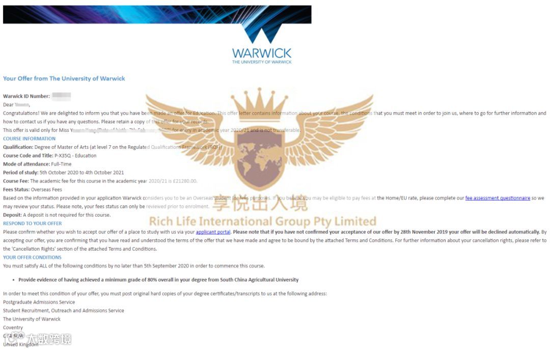 华威大学(The University of Warwick)位于英格兰中部华威郡和考文垂市交界处,创立于1965年,是英国顶尖研究型大学。华威大学位列2020年QS世界大学排名第62 ,2020THE世界大学排名第77 。华威大学以严苛的招生,高水准的学术研究和教学质量而闻名。华威大学在工、商、政、学各界均拥有卓越的口碑,在业界与牛津、剑桥、LSE、帝国理工、UCL并列被视为世界九大投资银行(Bulge Bracket)在英的6所目标院校(Target School)。克林顿访英时参观华威。华威商学院被誉为英国最顶尖的商学院之一;华威商学院的卓越表现使其在主要排行榜中稳居英国前5名,世界前30名,并处于持续上升的势头。在2017年《金融时报》全球排名中,华威商学院的金融硕士项目超越牛津大学,位列全英第1,世界第9。华威数学系和经济系常年居英国前三乃至第一。此外,其传媒、戏剧 、计算机科学等专业名列前茅。传媒和戏剧专业更是多次荣膺英国专业排名第一,也是中英大学工程教育与研究联盟成员。