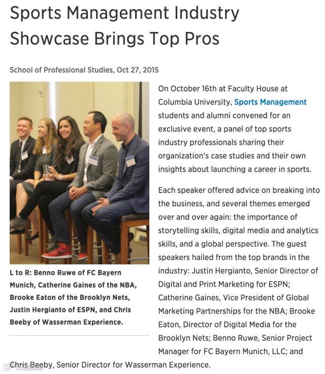 笔者当时获得心仪实习机会,怀着无比感激的心情一定要先给学院职业发展办公室(哥大体育管理专业所在学院有独立的职业发展办公室)点一个大大的赞!