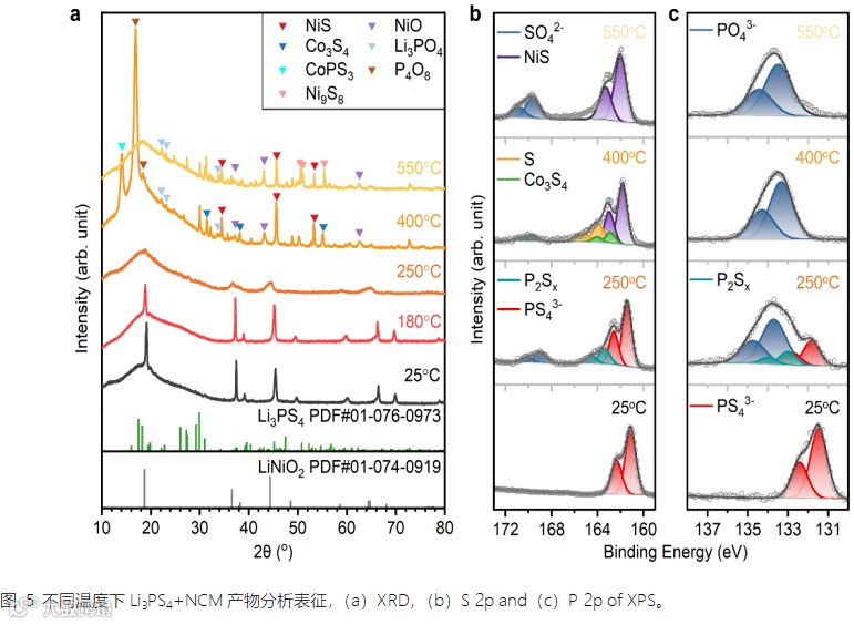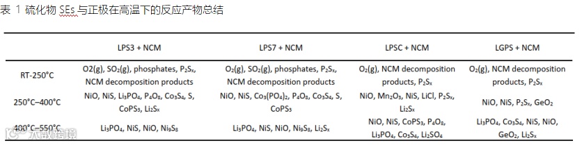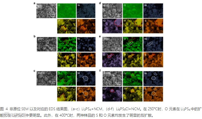 图4-图6是以Li3PS4和Li6PS5Cl为例的材料表征结果,分别代表着GSR失效路径以及SSR失效路径。其反应产物的主要共性与差异总结如下:(1)升温过程中,硫化物SEs中的S元素与正极中的O元素存在互扩散现象;趋向于生成过渡金属硫化物TM-S以及硫酸盐、磷酸盐等,温度越高现象越明显,代表着反应程度越高;(2)250℃之前,Li3PS4直接被O2氧化,生成大量SO2和磷酸盐(PO43-),而Li6PS5Cl没有SO2以及大量磷酸盐的生成,反应较微弱;(3)至400℃,所有样品均已产生过渡金属硫化物TM-S;(4)产物P4O8、Co3O4、CoPS3等率先出现在400℃的Li3PS4+NCM产物分析中,再次证明玻璃陶瓷硫化物SEs与正极热稳定性不如晶态硫化物SEs。