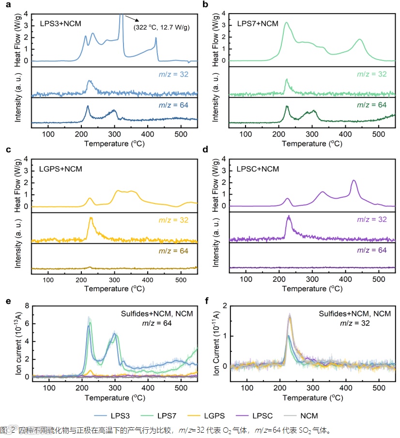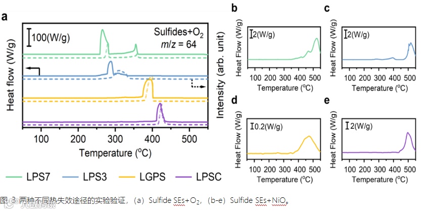 为了验证GSR与SSR反应机理的准确性,需要探究不同电解质在高温下与氧气、正极分解产物的反应活性。氧气氛围中的DSC-MS结果表明,四种硫化物SEs在高温下都会与O2发生剧烈反应,并且产生SO2,如图3a所示。更重要的是,Li3PS4/Li7P3S11在250℃~300℃下就与O2发生了反应,接近正极释氧的温度区间,其反应温度远低于另外两种电解质,这就证明了玻璃陶瓷态的两种电解质通过GSR失效的合理性。另一方面,选取过渡金属氧化物NiO代表正极高温分解的产物,DSC测试发现,硫化物SEs在更高温度下会与NiO发生放热副反应,反应起始温度普遍高于300℃,如图3b-e所示。结果证明了更高温度下硫化物SEs通过与过渡金属氧化物反应的SSR失效路径的合理性。总之,硫化物SEs与O2、NiO的反应时序差异侧面证明了两种失效机理的正确性。
