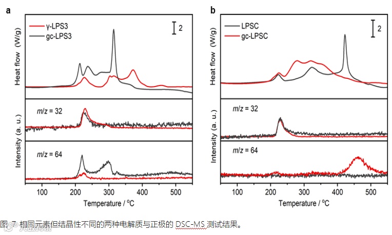 所提出的两种硫化物全固态电池失效模式,其差异产生的深层原因值得探索。两种失效路径下的电解质有着不同的结晶性以及元素组成,为探究SEs结晶程度以及元素组成的对于热稳定性的影响,研究中还制备了结晶性不同但元素组成一致的硫化物SEs,进行DSC-MS测试,如图7所示。晶态γ-LPS3(对标文中Li3PS4)与 NCM 释放的O2的反应活性显著降低;与之相反,玻璃陶瓷态gc-LPSC(对标文中Li6PS5Cl)与NCM的反应比Li6PS5Cl更强烈,表现为 200℃ 附近的放热峰更高,同时伴有少量SO2产生。上述结果表明结晶程度的变化甚至影响了电解质失效的主要路径,硫化物SEs的晶体结构确实会影响它们与正极材料的热安全性。这部分内容在今后应进行更详实的分析,以更深层次揭示固态电解质热安全特性与其微观结构的相互关系。