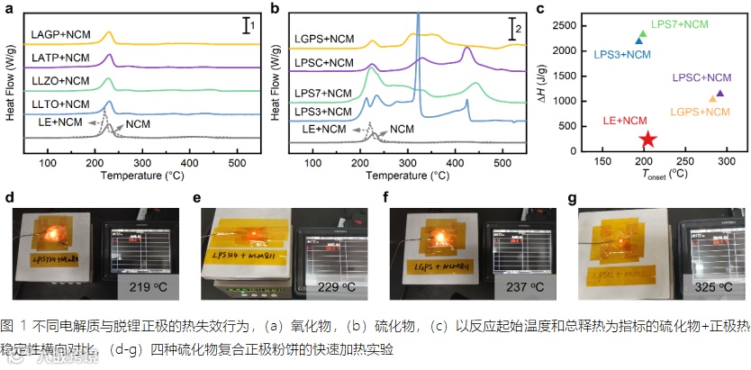 无论以上述何种指标,玻璃陶瓷态的Li3PS4/Li7P3S11与NCM的热稳定性都低于晶态的Li6PS5Cl/Li10GeP12S2,具体表现为Li3PS4/Li7P3S11+NCM的原有正极相变释氧峰提前或增强,并释放更多的热量。此外,该研究还利用不同硫化物SEs的复合正极粉饼,进行快速加热滥用实验的探究。四种硫化物基复合正极均在加热条件下发生了起火燃烧现象,如图1d-g,但是发生燃烧的温度各不相同,总体热稳定性规律与上述材料DSC热分析排序一致。不同硫化物SEs与正极的热失效行为有着明显的差异,其背后的机理引人深思。