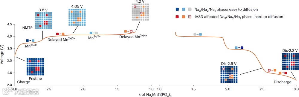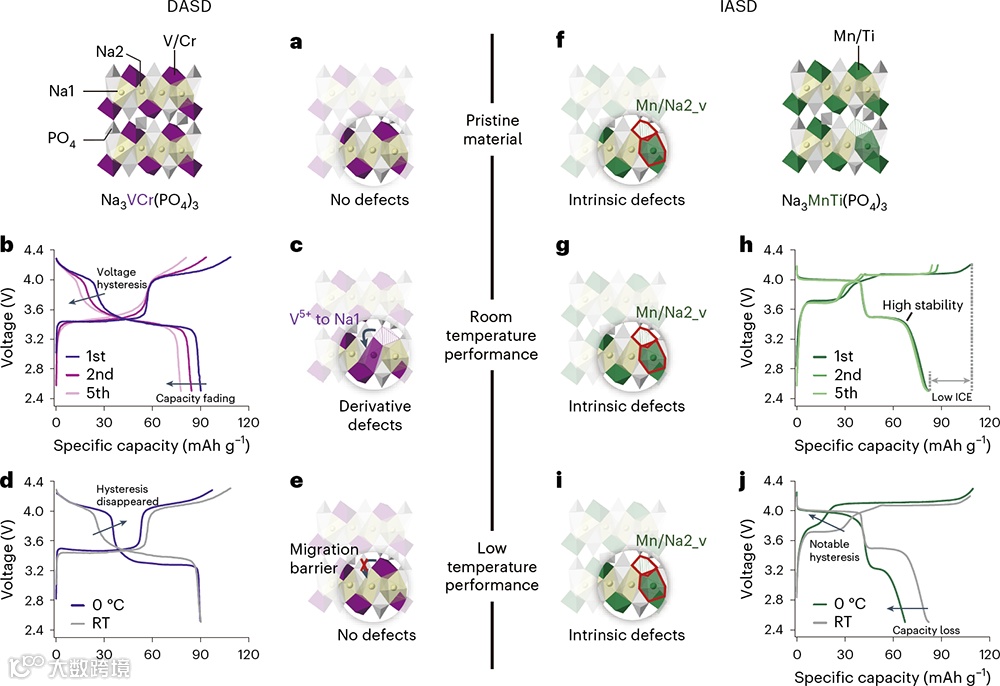 近日,中国科学院物理研究所/北京凝聚态物理国家研究中心胡勇胜研究员和过程所赵君梅研究员合作,揭示了锰基NASICON型正极材料电压滞后的机理。作者首先从充放电行为的差异上入手,定义了聚阴离子材料中的两类缺陷(见图2):即在烧结过程中产生的本征反占位缺陷(IASD)和伴随充放电过程产生的衍生反占位缺陷(DASD)。通过光谱、结构表征和理论计算,在富锰NASICON型材料(Na3MnTi(PO4)3)中捕捉到Mn占据Na2(Wyckoff位置为18e)空位(Mn/Na2_v)的IASD。进而揭示了电压滞后的起因:Mn/Na2_v IASD阻断了Na+离子扩散通道,导致了滞后的Mn2+/3+/4+氧化还原反应,因此出现电压极化和容量损失。