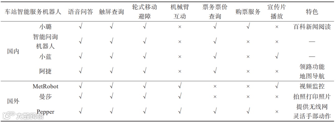 在国外,车站智能服务机器人在轨道交通站内逐步投入试用。2008年,韩国首尔的车站智能服务机器人“MetRobot”在地铁站内投入试用,站内功能包含语音问答、信息触屏查询、视频监控、机械手臂互动、轮式移动避障等功能,通过屏幕触控、语音询问、动作交互进行人机交互。2017年,俄罗斯莫斯科机器人“曼莎”投入试用,具备语音交互、信息触屏查询、机械臂互动和轮式移动避障功能,增加了拍照打印照片特色服务。2017年,日本东京机器人“Pepper”开始服务试用于地铁站,在实现语音问答、信息触屏查询、机械臂互动和轮式移动避障功能的同时,还提供购票、无线网服务,且具备非常灵活的手部动作。