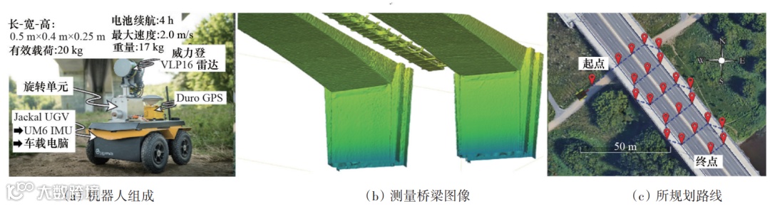 对于桥梁桥面及桥底检测,Phillips等提出一种轮式移动机器人,如图6(a)所示,可自主导航并在桥梁内或附近行驶,检查桥梁的缺陷;机器人配备了激光雷达,自动收集桥梁的3D轮廓,如图6(b)所示。该机器人的有效载荷20kg,电池寿命4h,最大速度2m/s,重量17kg。但是,在每次检查之前都需要人工预规划路线,路线如图6(c)所示。