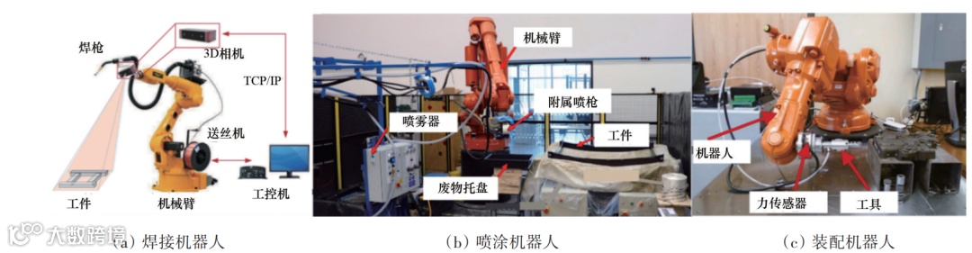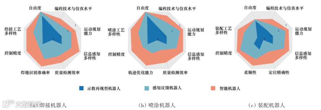 在机器人技术层面,虽然焊接、喷涂、装配机器人在外形上相似,技术路线相似,但是在应用技术侧重点不同。图2总结了3种机器人的在3个发展阶段中的特性,可以从2个维度观察。在机器人从示教再现、感知反馈向智能化发展的进程来看,智能水平逐渐提升。机器人本体多为四至六自由度,为实现复杂空间内的轨迹运动与多姿态作业提供可能;最初的人工示教、已投入应用的离线编程、转变为研究中的基于增强现实等技术的人机协作方式在线编程,结合仿真与数值模拟,逐步完善前处理流程;传感器多样性增大,使机器人自身位置姿态、力觉、视觉、电弧、激光测距等信息感知越来越全面,视觉引导与图像处理等技术使机器人可适应复杂环境变化;运动轨迹由最初的示教存储向着点到点的自主路径规划、自主轨迹规划方向不断突破;控制技术的不断精进,工业机器人跟踪规划轨迹的精度不断提升,精细化作业和柔性生产成为可能;结合机器视觉、机器学习等技术,机器人识别零部件和检测作业质量功能从无到有,作业准确性进一步提升。从3种机器人的发展方向来看,焊接机器人关注于与工件接触的焊枪末端控制技术与焊缝识别方法,喷涂机器人侧重于复杂空间内的轨迹优化与跟踪,而装配机器人则在复杂工件外形的柔性抓取以及装配过程的精确力控、柔顺控制上重点研究。另外,工业机器人都在结合机器视觉技术,向着实现自主目标识别与引导、作业后质量评估等技术深入研究。