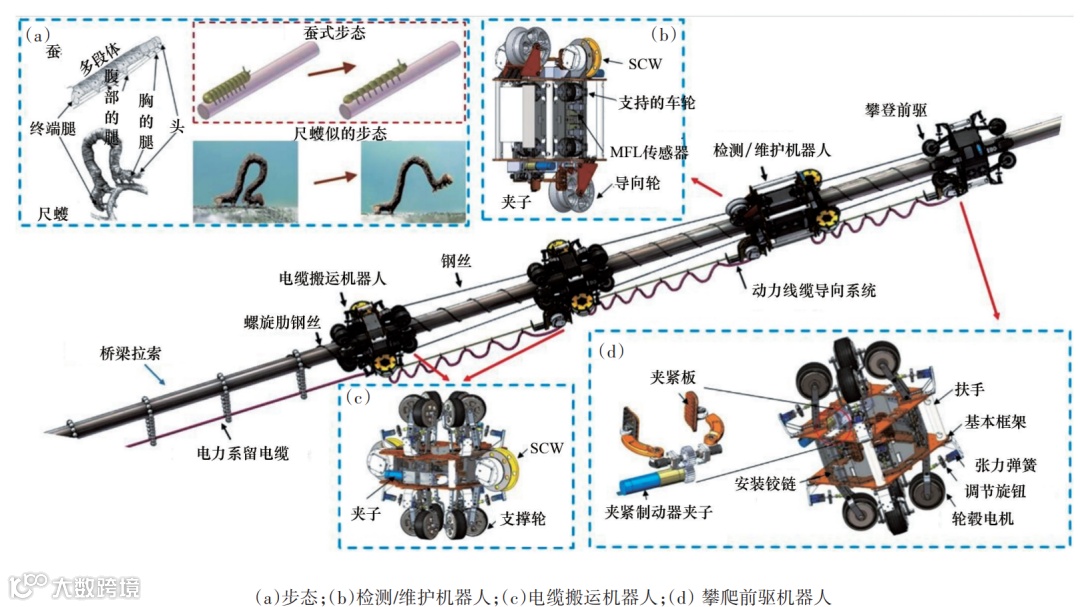 桥梁巡检的巡检需求多样,包括桥梁桥面、桥底、桥的斜拉索、桥梁高处等的检测,因此产生了不同类型的检测机器人。