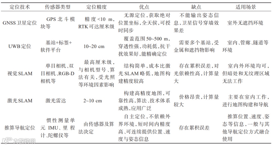 机器人在移动过程中需要实时获取定位数据才能规划路径、执行巡检等特定任务或实现机械臂的定点到位、跟随等功能。常见定位技术见表3。