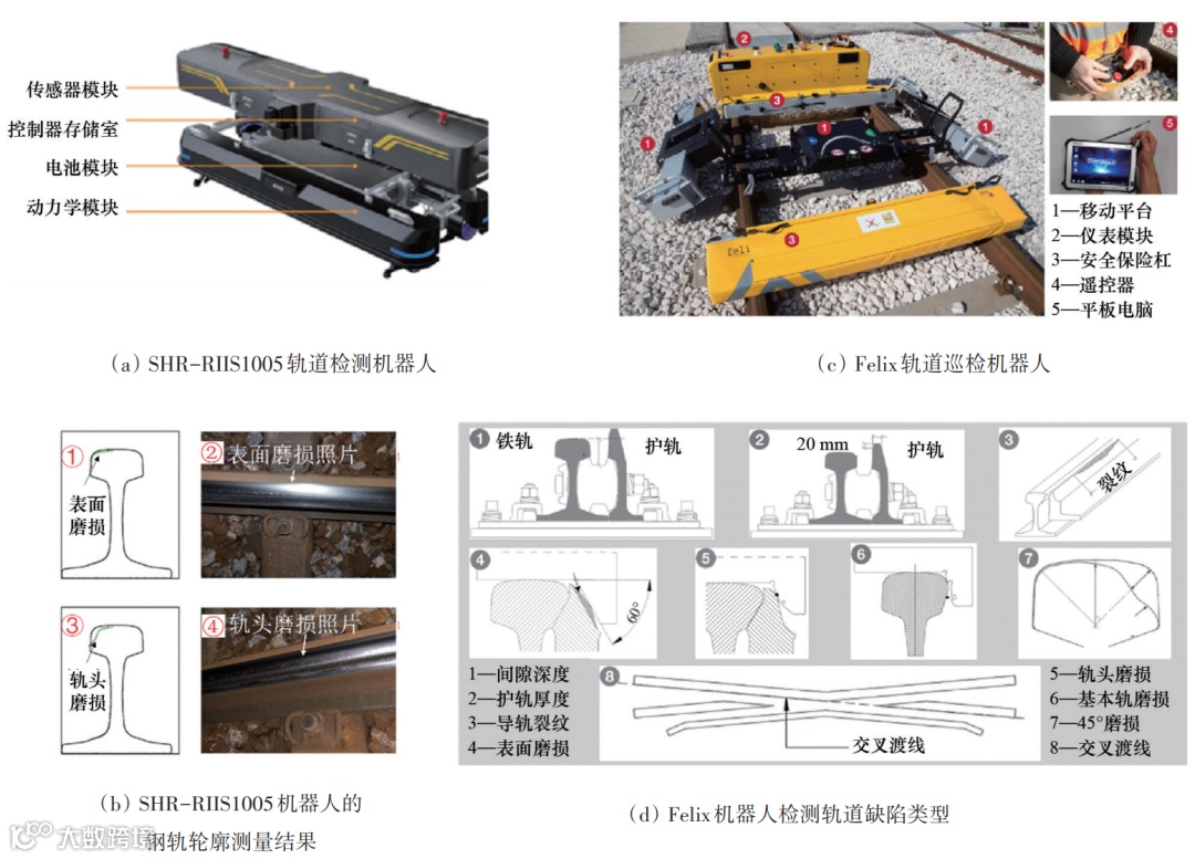 轨道巡检机器人通常为有轨式移动机器人,即将待检测轨道作为行驶轨道,同时搭载视觉、超声等无损检测传感器对轨道的状态进行检测,可自动检出多种异常情况。