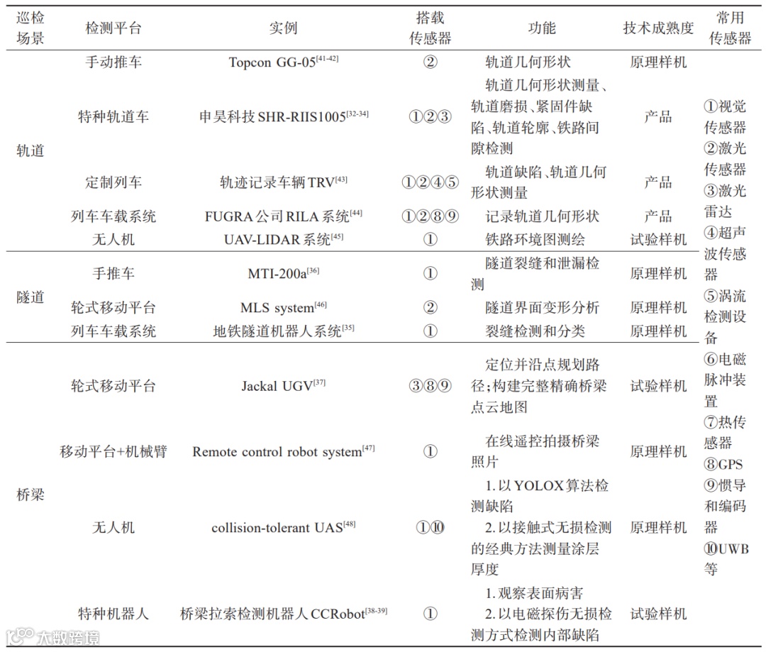 在轨道交通领域的巡检作业中,根据巡检对象和检测任务的不同,巡检机器人的外部结构、移动平台、传感器类型、导航方式和检测方法具有多样性,对轨道、隧道、桥梁3种典型场景下的巡检机器人进行总结。