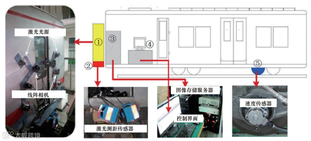 对于搭载于列车上的巡检系统,Zhang等提出了一种基于摄像头的地铁隧道检测系统,如图4所示。该系统搭载CMOS(complementary metal-oxide-semiconductor)线阵相机、激光测距传感器、速度传感器,使用形态图像处理算法来分割具有潜在裂纹缺陷的局部暗区,可以提取裂缝和断开的物体,准确率在90%以上。该方法在北京地铁1号线进行了测试。