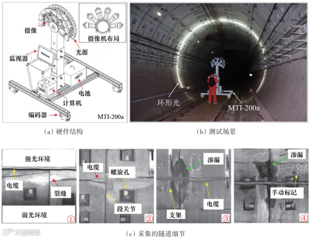 对于搭载于移动平台的巡检系统,Huang等提出了一种名为MTI-200a(Metro Tunnel Inspection-200a)的检查系统,结构如图5(a)所示。巡检系统运行于轨道上,如图5(b)所示,系统采用结构光相机,光源照射于隧道上,搭载多个摄像头,用于检测地铁隧道的裂缝和泄漏情况,采集到的隧道图像细节信息如图5(c)所示;采用基于全卷积神经网络(FCN)算法的图像识别技术进行缺陷特征提取,可以快速准确地识别隧道壁中的缺陷。