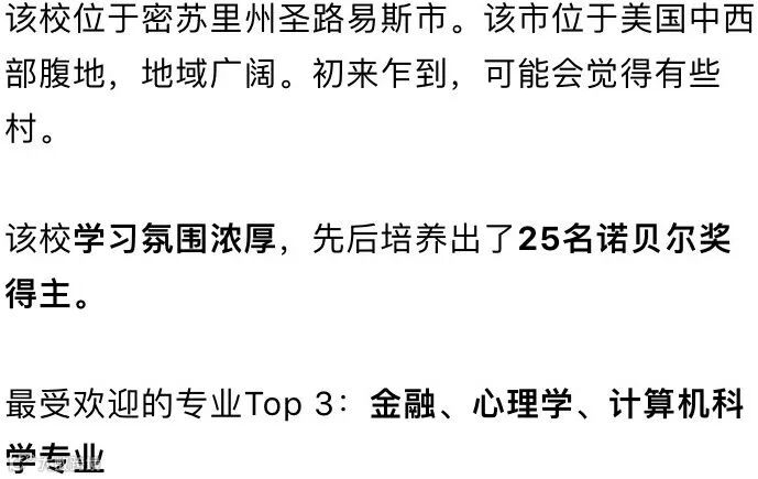 圣路易斯华盛顿大学Washington University (St. Louis),简称华盛顿大学。U.S. News排名#19。美国9所“新常春藤”名校之一。