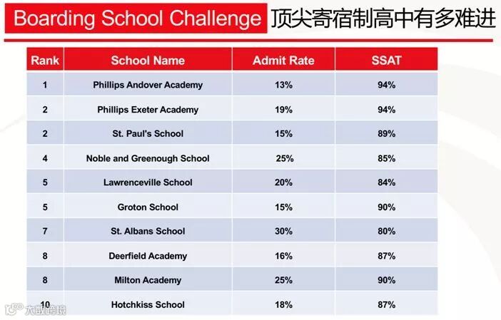根据哈佛大学自己的日报The Harvard Crimson报道,以Class of 2017为例,其中6%的录取学生只来自10所高中。在哈佛大学录取的每20名新生中,一定有一个学生来自于下面7所高中里的其中一所: