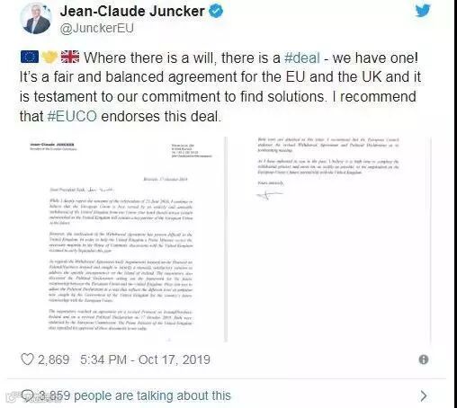 当地时间10月17日上午,欧盟委员会主席容克与英国首相约翰逊同时宣称,欧盟与英国就新的“脱欧”方案达成一致。