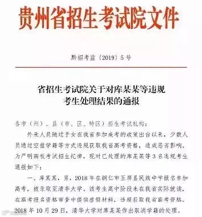 贵州广播电视台2频道微信公众号”百姓关注“消息,2019年4月30日,贵州省招生考试院通报了关于对库某某等违规考生处理的结果。