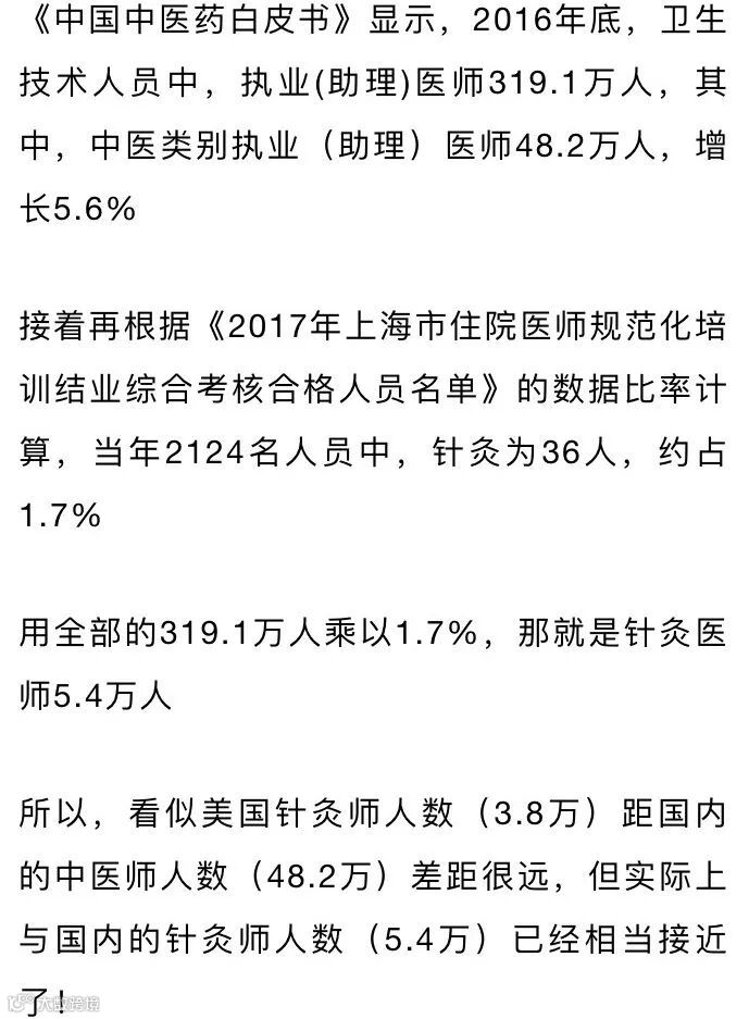因为没有详细国内针灸行业的调查报告,所以我粗略地根据《中国中医药白皮书》和《2017年上海市住院医师规范化培训结业综合考核合格人员名单》进行初步演算