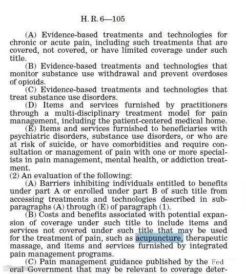 再来看,这部250页的H.R.6法案中,针灸(Acupuncture)出现在第105页,其中提到:针灸作为其中一种治疗疼痛的疗法,将会被美国卫生部评估,综合循证医学的证据,在一年内给出一个疼痛最佳治疗方案的循证分析。