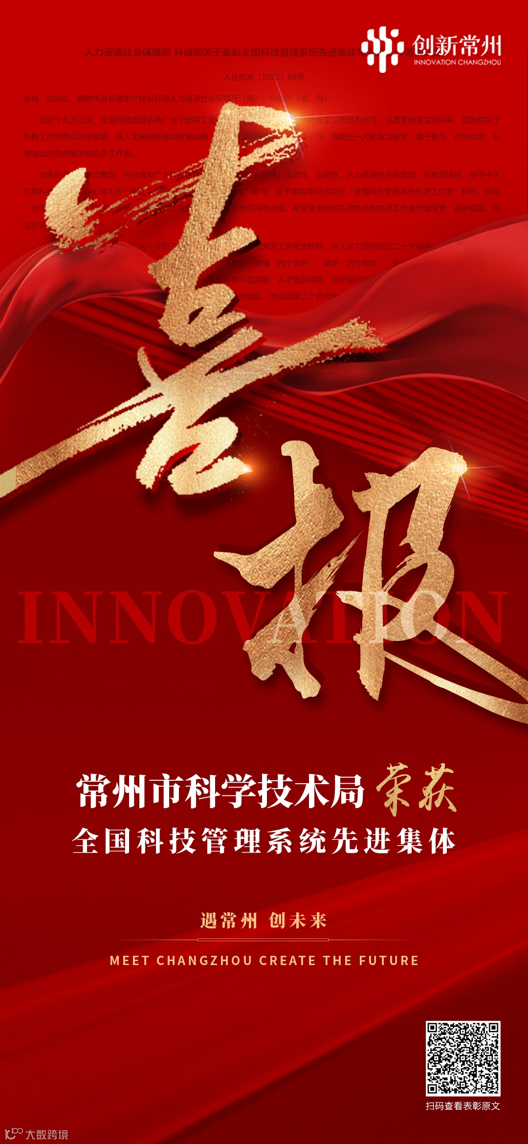 为表彰先进、树立典型,充分激发广大科技管理干部干事创业的积极性、主动性、创造性,人力资源社会保障部、科技部印发《关于表彰全国科技管理系统先进集体和先进工作者的决定》,常州市科学技术局获评全国科技管理系统先进集体。