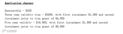 五年有效期签证,总共申请费为10,000澳币,分为两笔支付:第一笔申请费为1000澳币,签证获签之前,支付第二笔签证申请费9000澳币。